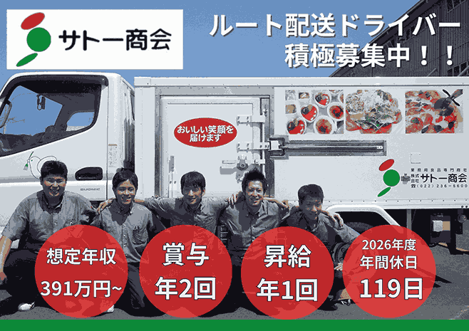 | 勤務時間 | 06:00〜15:00(実働: 8時間、休憩: 60分) 平均所定労働時間:1ヶ月あたり166時間 平均勤務日数:1ヶ月あたり21日 【勤務時間補足】 週休2日制(基本的に土日祝日、2025年度年間休日115日) ※会社カレンダーによります。(年に数回土曜当番があります。) ※勤務時間は配送コースにより多少前後する可能性があります。 ※2026年度からは年間休日119日の予定です。 |